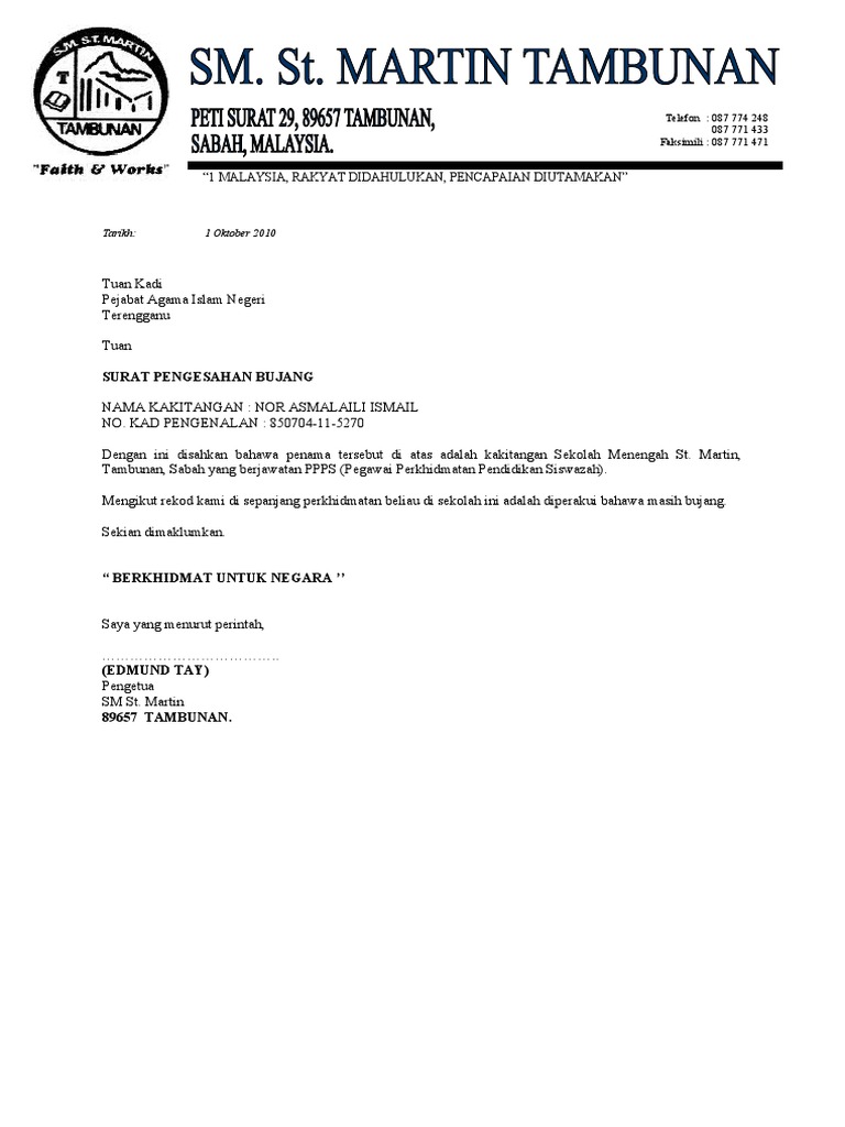 I tidak mempunyai apa apa rekod jenayah. Contoh format surat pengesahan majikan (2) via www.slideshare.net. Diharapkan berada dalam perhatian pihak tuan. Surat akuan bujang pdrm | dapatkan surat akuan status diri / surat akuan bujang dan ianya boleh diperolehi oleh satu daripada berikut ketua kampung. Save save surat akuan bujang for later. Today i want to share bout dis. Berikut adalah maklumat yang berkaitan: Salam sejahtera, ini adalah contoh surat akuan bujang yang aku dapat dari internet yang boleh digunakan untuk berkahwin. Tp x smue negeri cmtu. Surat akuan pengesahan pendapatan ini adalah sebagai pengesahan pendapatan pemohon daripada daripada orang tertentu. Tujuan & manfaat dari surat pernyataan adalah sebagai penjamin kepastian hokum. The collection that consisting of chosen picture and the best amongst. Saya dengan ini mengesahkan bahawa beliau adalah merupakan kakitangan di syarikat ini.